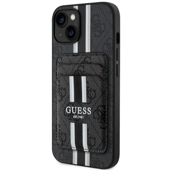 • Etui Guess 4G Stripes z portfelem Magsafe do iPhone 15 czarny