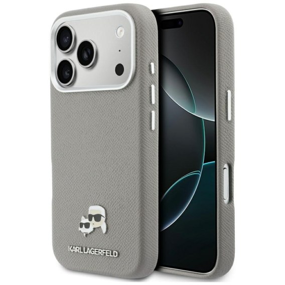Etui Karl Lagerfeld Karl & Choupette Head Pins Saffiano MagSafe do iPhone 17 Pro szary