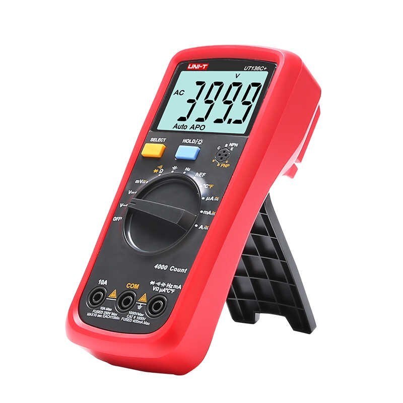 - Natężenie prądu stałego DC: 400 µA/4 mA/40 mA/400 mA/4 A/10 A ±(1,0%+5)