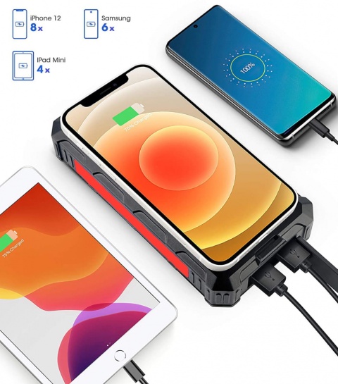 Power Bank solarny z możliwością ładowania 4 urządzeń jednocześnie świetnie sprawdzi się w każdej sytuacji. Wyjazd na kamping czy wybranie się w podróż nie będzie wiązało się z koniecznością wzięcia kilku powerbanków. Połóż urządzenie w świetle słonecznym i miej cały czas dostęp do energii. Wyposażony w latarkę jeszcze świetnie przyda się w awaryjnej sytuacji.