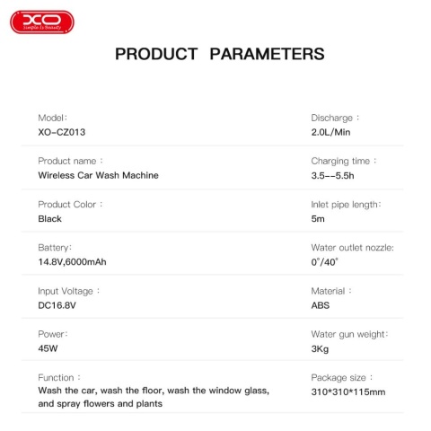 XO CZ013 to bezprzewodowy pistolet na wodę z wieloma zastosowaniami takimi jak: mycie auta/podłóg/okien, opryski roślinne oraz wieloma innymi. W zestawie znajduje się ładowarka, 2 dysze oraz 5 m przewodu wlotu wody. Przepływ wody wynosi 2 L/min a czas ładowania - od 3.5 do 5.5 godziny. Urządzenie ma moc 45 W.